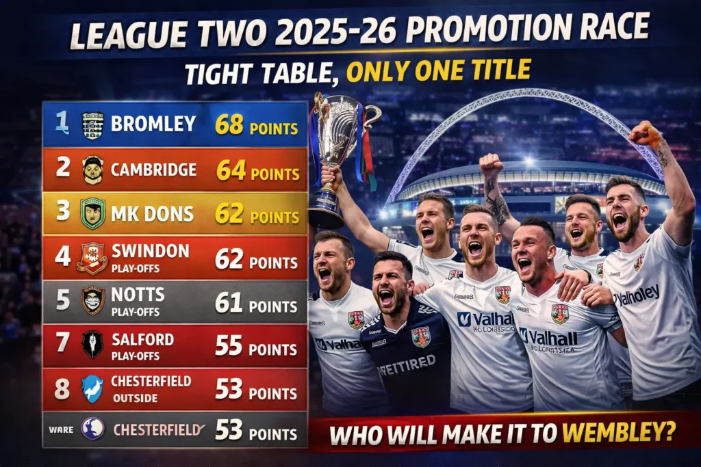 Three clubs will earn automatic promotion to League One — and as things stand, the top three looks like this: Bromley lead on 68 points, Cambridge United sit second on 64, and Milton Keynes Dons hold third on 62. MK Dons have the best goal difference in the play-off contention group, a stat that could prove decisive if the table tightens further.
